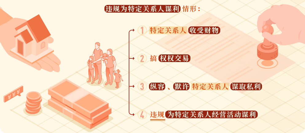 4.违规为特定关系人经营活动谋利。《条例》第一百零四条规定,利用职权或者职务上的影响,为配偶、子女及其配偶等亲属和其他特定关系人在审批监管、资源开发、金融信贷、大宗采购、土地使用权出让、房地产开发、工程招投标以及公共财政收支等方面谋取利益,情节较轻的,给予警告或者严重警告处分;情节较重的,给予撤销党内职务或者留党察看处分;情节严重的,给予开除党籍处分。利用职权或者职务上的影响,为配偶、子女及其配偶等亲属和其他特定关系人吸收存款、推销金融产品、经营名贵特产类特殊资源等提供帮助谋取利益的,依照前款规定处理。