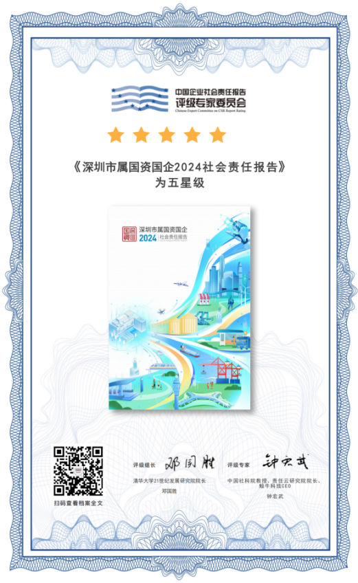 该报告首次申请参评即斩获中国企业社会责任报告评级专家委员会“五星”评级(点击文末“阅读原文”查看原报道),被评价为“一份卓越的社会责任报告”,标志着深圳市属国资国企在社会责任管理、信息披露和可持续发展领域的实践成效达到国内领先水平,积极展现新时代国资国企服务经济社会高质量发展的责任担当与良好形象。