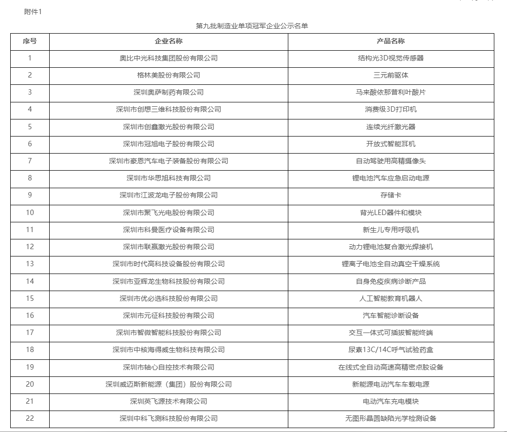 近日,深圳市工业和信息化局公示第九批国家制造业单项冠军企业名单,全市共有22家企业上榜。其中,14家为深高新投服务企业,包括创鑫激光、时代高科技、轴心自控等3家已投企业,投资总额达1.77亿元。
