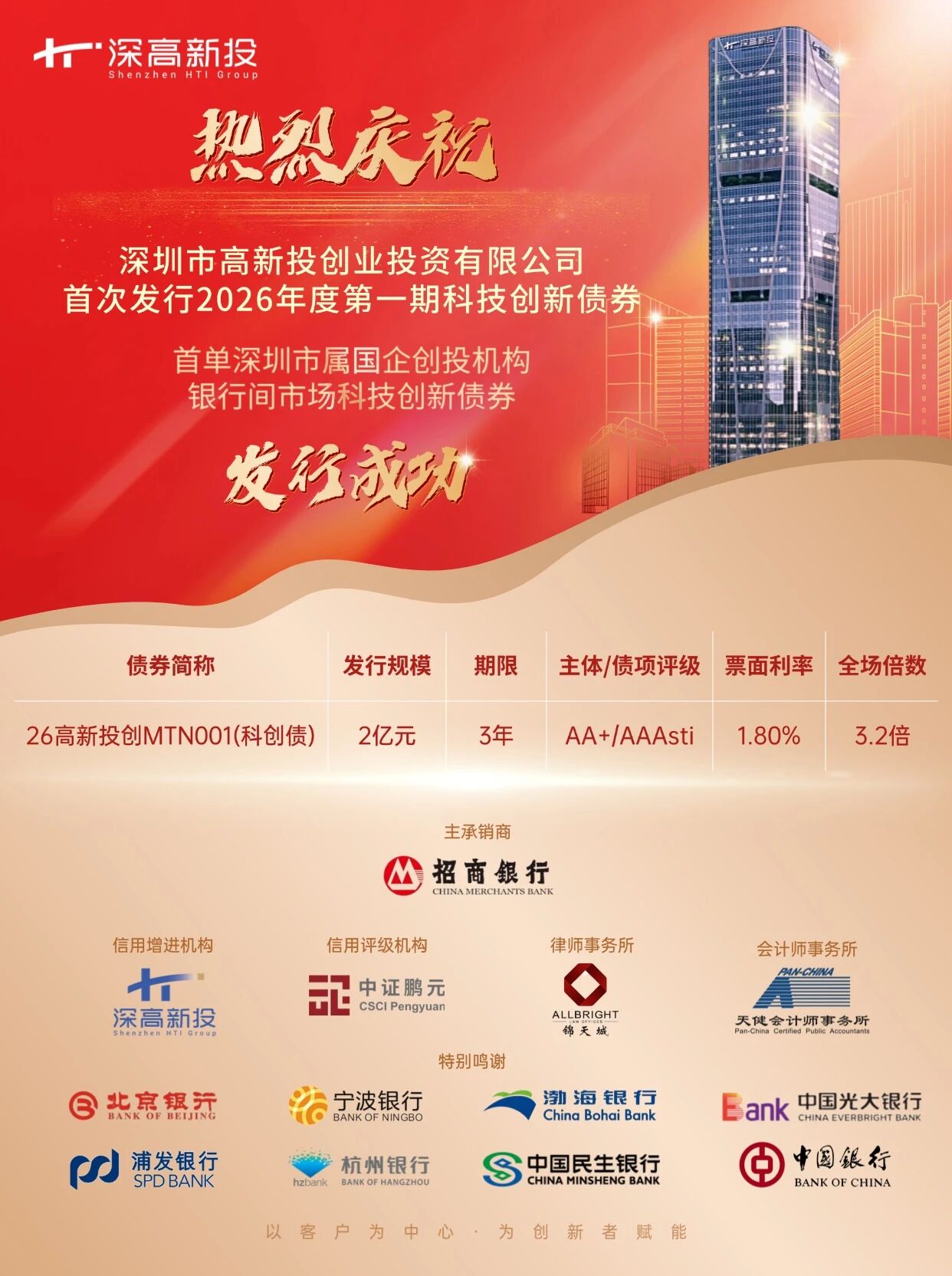 1月19日,深圳市高新投创业投资有限公司(简称“深高新投创投”)2026年第一期科技创新公司债券成功发行,本期债券注册金额10亿元,首期发行规模2亿元,期限3年,票面利率1.8%,创今年全国科创债利率新低,认购倍数达3.2倍。该单债券为首单深圳市属国企创投机构银行间市场科技创新债券,标志着深高新投创投在运用市场化金融工具服务科技创新方面取得重要突破,也为深圳科创金融生态建设注入新动能。