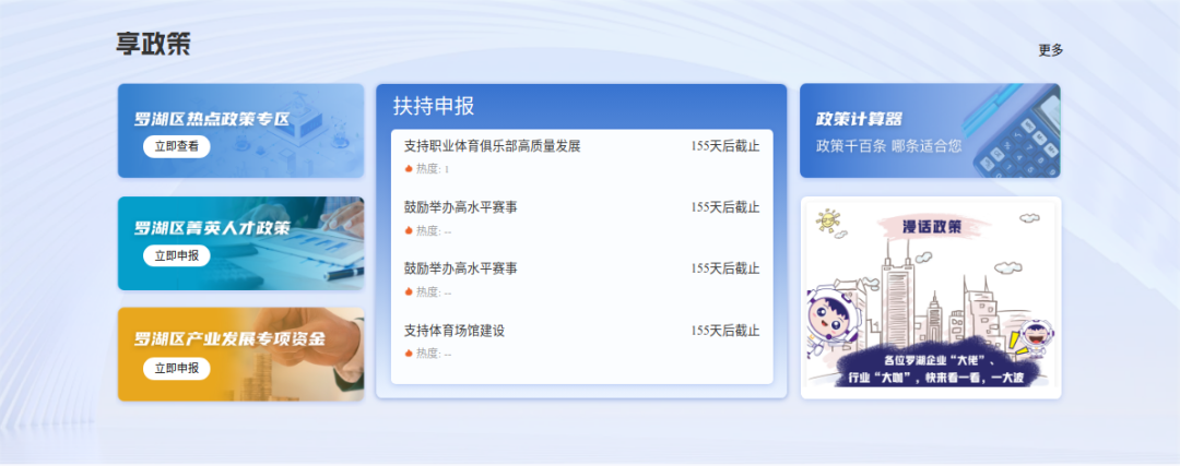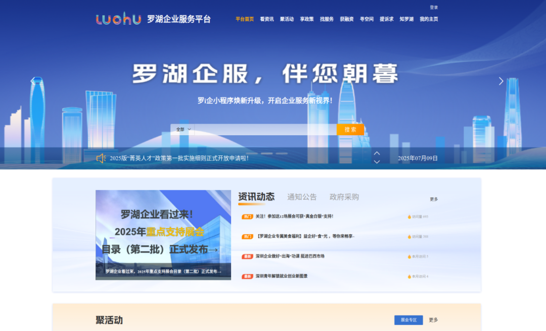 罗湖企业服务平台,涵盖看资讯、聚活动、享政策、找服务、获融资、寻空间、提诉求、知罗湖八大功能版块,汇聚政策、空间、融资、诉求、活动、服务商对接等等核心场景,为企业提供:
