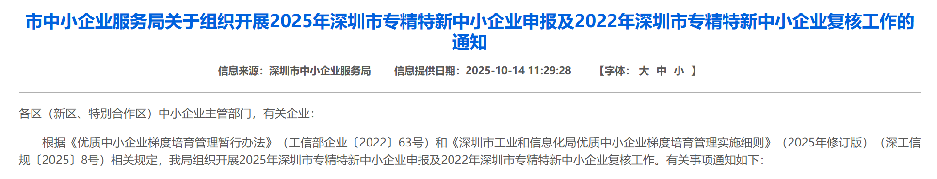 申报资格、具体认定标准等详细信息,请查阅深圳市中小企业服务局发布的原通知及附件: