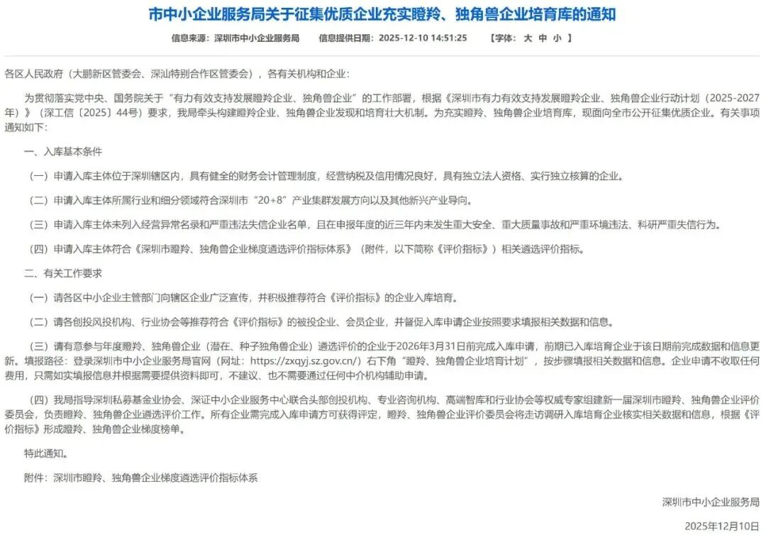 为贯彻落实党中央、国务院关于“有力有效支持发展瞪羚企业、独角兽企业”的工作部署,根据《深圳市有力有效支持发展瞪羚企业、独角兽企业行动计划(2025-2027年)》(深工信〔2025〕44号)要求,我局牵头构建瞪羚企业、独角兽企业发现和培育壮大机制。为充实瞪羚、独角兽企业培育库,现面向全市公开征集优质企业。