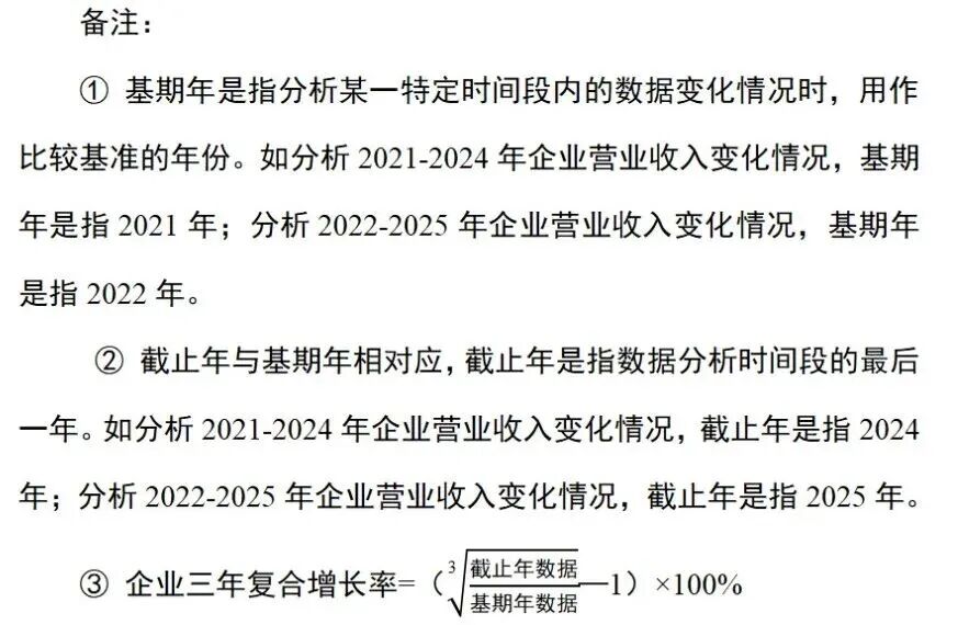 (1)企业成立时间距基期年不超过10年(不含基期年),基期年营业收入达到3000万元且三年复合增长率达到20%,且截止年正增长。
